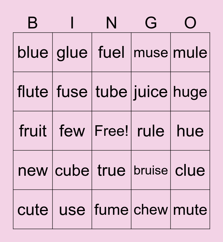 This bingo card has a free space and 24 words: cube, use, tube, cute, mule, blue, flute, glue, rule, true, juice, fruit, bruise, clue, fuse, chew, hue, fuel, huge, few, mute, new, muse and fume.