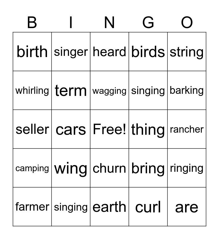 This bingo card has a free space and 25 words: wing, earth, wagging, farmer, string, birth, whirling, singer, thing, churn, singing, seller, bring, ringing, term, stinging, rancher, heard, barking, cars, are, singing, camping, birds and curl.