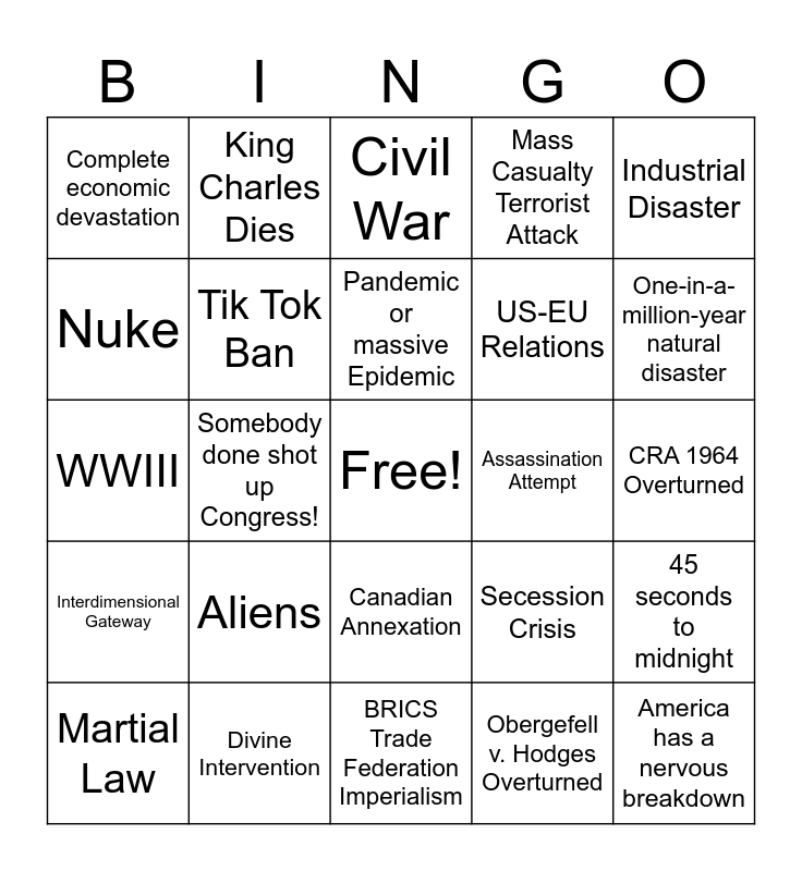 This bingo card has a free space and 24 words: Aliens, Divine Intervention, Pandemic or massive Epidemic, Martial Law, Industrial Disaster, Complete economic devastation, Nuke, King Charles Dies, Assassination Attempt, Canadian Annexation, US-EU Relations, WWIII, Secession Crisis, 45 seconds to midnight, Tik Tok Ban, Obergefell v. Hodges Overturned, CRA 1964 Overturned, Civil War, One-in-a-million-year natural disaster, Somebody done shot up Congress!, America has a nervous breakdown, Interdimensional Gateway, Mass Casualty Terrorist Attack and BRICS Trade Federation Imperialism.