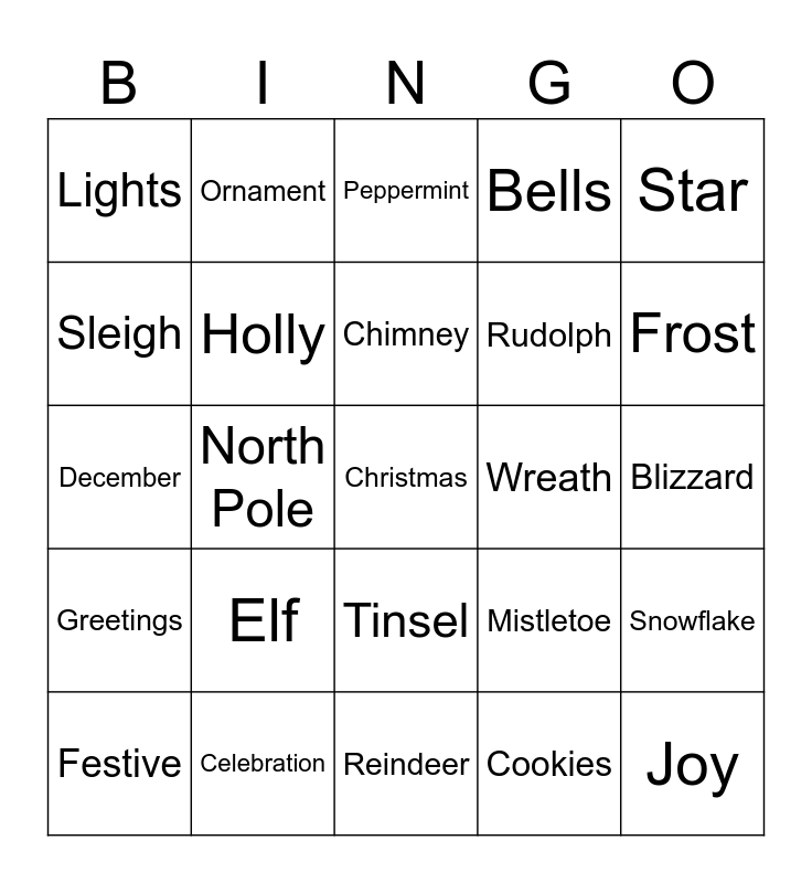 This bingo card has 51 words: Free!, Christmas, Santa, Reindeer, Elf, Snowman, Ornament, Gift, Sleigh, Stocking, Holly, Bells, Snowflake, Mistletoe, Candle, Gingerbread, Chimney, Wreath, Carol, Star, North Pole, Cookies, Lights, Rudolph, Tree, Joy, Frost, Icicle, Festive, Peppermint, Candy Cane, Fireplace, Holiday, Peace, Noel, Celebration, Angel, Nativity, Eggnog, Tradition, Blizzard, Greetings, Snowball, Feast, Winter, Joyful, December, Cozy, Garland, Tinsel and Wish.