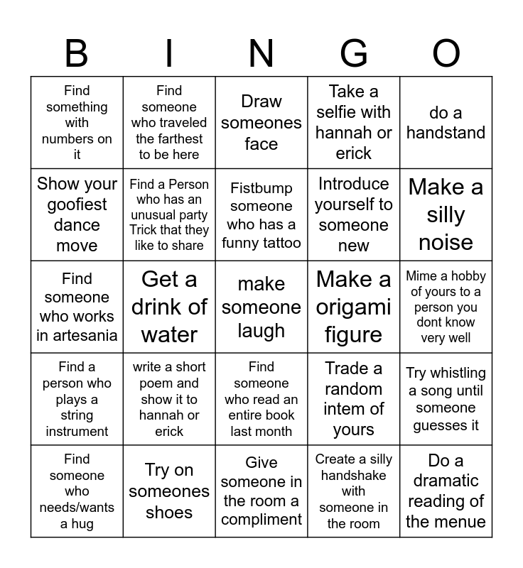 This bingo card has a free space and 24 words: write a short poem and show it to hannah or erick, Try on someones shoes, Fistbump someone who has a funny tattoo, Find someone who needs/wants a hug, do a handstand, Find something with numbers on it, Show your goofiest dance move, Find someone who traveled the farthest to be here, Make a origami figure, Find someone who read an entire book last month, Introduce yourself to someone new, Find someone who works in artesania, Trade a random intem of yours, Try whistling a song until someone guesses it, Find a Person who has an unusual party Trick that they like to share, Create a silly handshake with someone in the room, Mime a hobby of yours to a person you dont know very well, Draw someones face, Make a silly noise, Get a drink of water, Do a dramatic reading of the menue, Find a person who plays a string instrument, Take a selfie with hannah or erick and Give someone in the room a compliment.