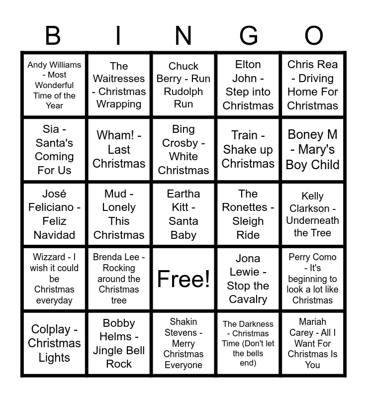 This bingo card has 26 words: Free!, The Darkness - Christmas Time (Don't let the bells end), Bing Crosby - White Christmas, Bobby Helms - Jingle Bell Rock, Chris Rea - Driving Home For Christmas, Andy Williams - Most Wonderful Time of the Year, Sia - Santa's Coming For Us, The Waitresses - Christmas Wrapping, Kelly Clarkson - Underneath the Tree, Jona Lewie - Stop the Cavalry, Train - Shake up Christmas, José Feliciano - Feliz Navidad, Perry Como - It's beginning to look a lot like Christmas, Colplay - Christmas Lights, Mud - Lonely This Christmas, East 17 - Stay Another Day, Elton John - Step into Christmas, Wizzard - I wish it could be Christmas everyday, Chuck Berry - Run Rudolph Run, Eartha Kitt - Santa Baby, Boney M - Mary's Boy Child, Shakin Stevens - Merry Christmas Everyone, The Ronettes - Sleigh Ride, Brenda Lee - Rocking around the Christmas tree, Wham! - Last Christmas and Mariah Carey - All I Want For Christmas Is You.