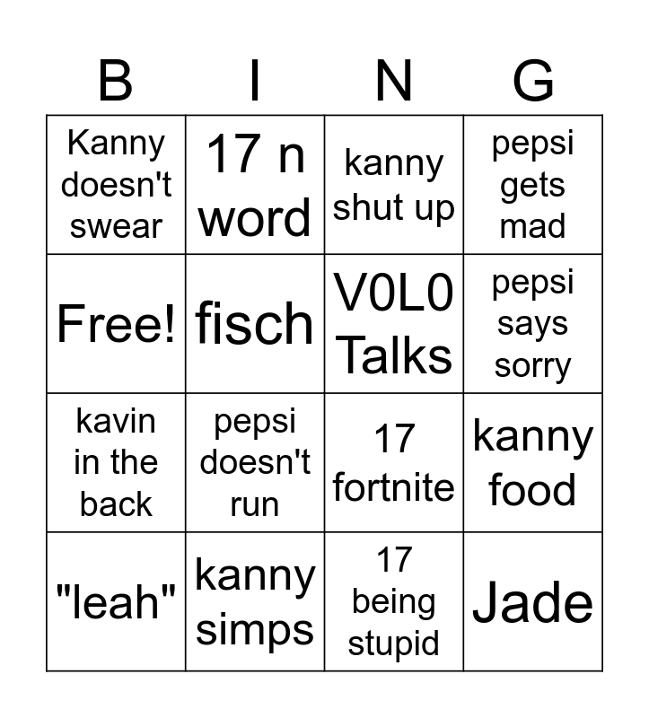 This bingo card has 16 words: kanny simps, kanny food, kanny shut up, Kanny doesn't swear, kavin in the back, 17 n word, 17 fortnite, 17 being stupid, Free!, fisch, "leah", pepsi gets mad, pepsi doesn't run, pepsi says sorry, V0L0 Talks and Jade.
