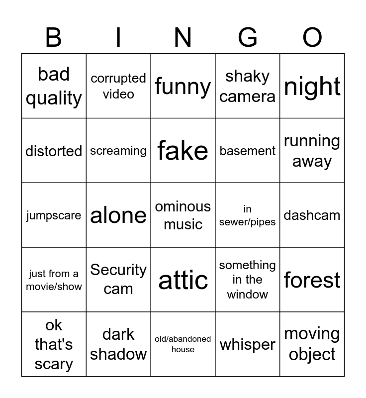 This bingo card has a free space and 24 words: Security cam, dark shadow, fake, ok that's scary, night, bad quality, distorted, corrupted video, in sewer/pipes, attic, basement, jumpscare, something in the window, forest, screaming, whisper, dashcam, funny, running away, alone, moving object, just from a movie/show, shaky camera and old/abandoned house.
