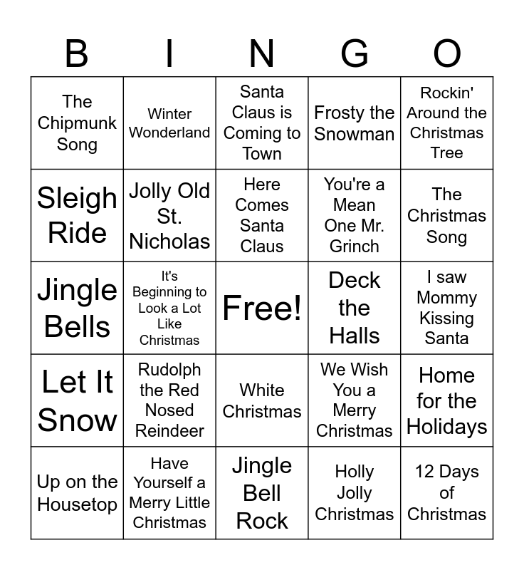 This bingo card has a free space and 24 words: Rudolph the Red Nosed Reindeer, Have Yourself a Merry Little Christmas, Here Comes Santa Claus, Up on the Housetop, Rockin' Around the Christmas Tree, The Chipmunk Song, Sleigh Ride, Winter Wonderland, Deck the Halls, White Christmas, You're a Mean One Mr. Grinch, Jingle Bells, We Wish You a Merry Christmas, Home for the Holidays, Jolly Old St. Nicholas, Holly Jolly Christmas, I saw Mommy Kissing Santa, Santa Claus is Coming to Town, The Christmas Song, It's Beginning to Look a Lot Like Christmas, 12 Days of Christmas, Let It Snow, Frosty the Snowman and Jingle Bell Rock.