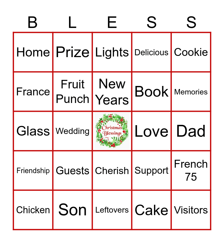 This bingo card has a free space and 70 words: Mom, Dad, Husband, Daughter, Son, Grandbaby, Delicious, Yummy, Cookie, Cake, French 75, Christmas Tree, Home, Lights, Beautiful, Wedding, Cherish, Book, Book Club, Friendship, Love, Support, Memories, Dinner, Desserts, Meatballs, Dip, Cheese, Cake, Chocolate, Prize, Winner, Trivia, Partner, Vacation, Family, Trip, Beach, Weather, France, London, Guests, Visitors, Table, Wine, Fruit Punch, Chicken, Lemon, Fruit, Cheese, Ornaments, Prize, Wrapping Paper, Gift Bags, Leftovers, Thanksgiving, New Years, Holidays, Puppy, Kitty, Glass, Fireplace, Picture, Window, Cold, Sweater, Reindeer, Santa, Holly and Candle.