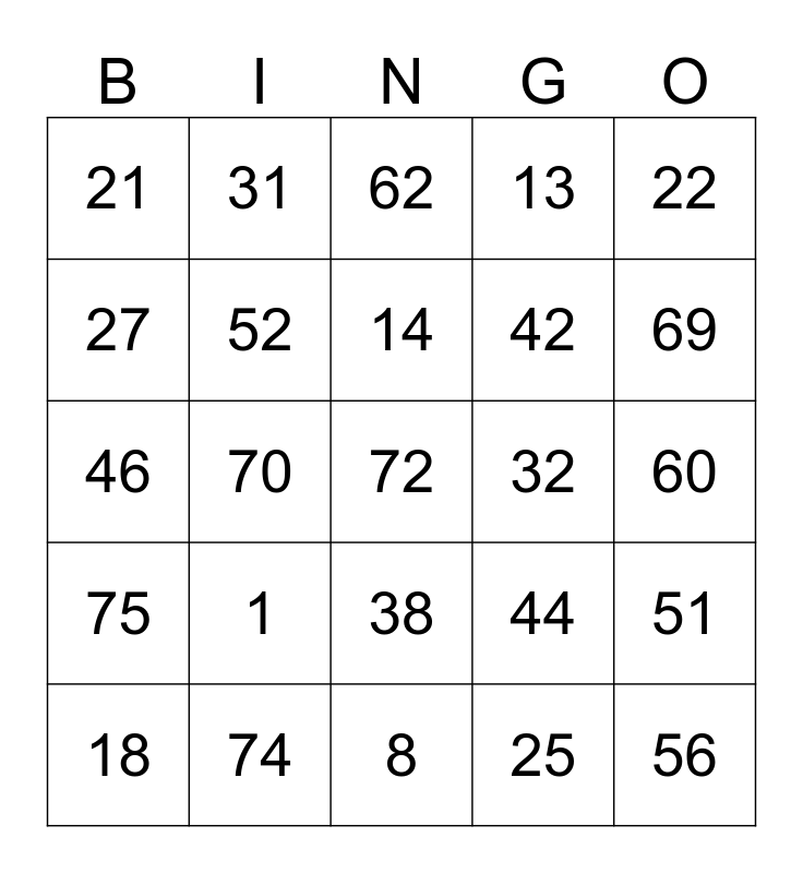 This bingo card has 25 words: 1, 8, 14, 18, 22, 21, 27, 31, 32, 38, 42, 46, 44, 51, 52, 56, 60, 62, 69, 70, 72, 74, 75, 13 and 25.