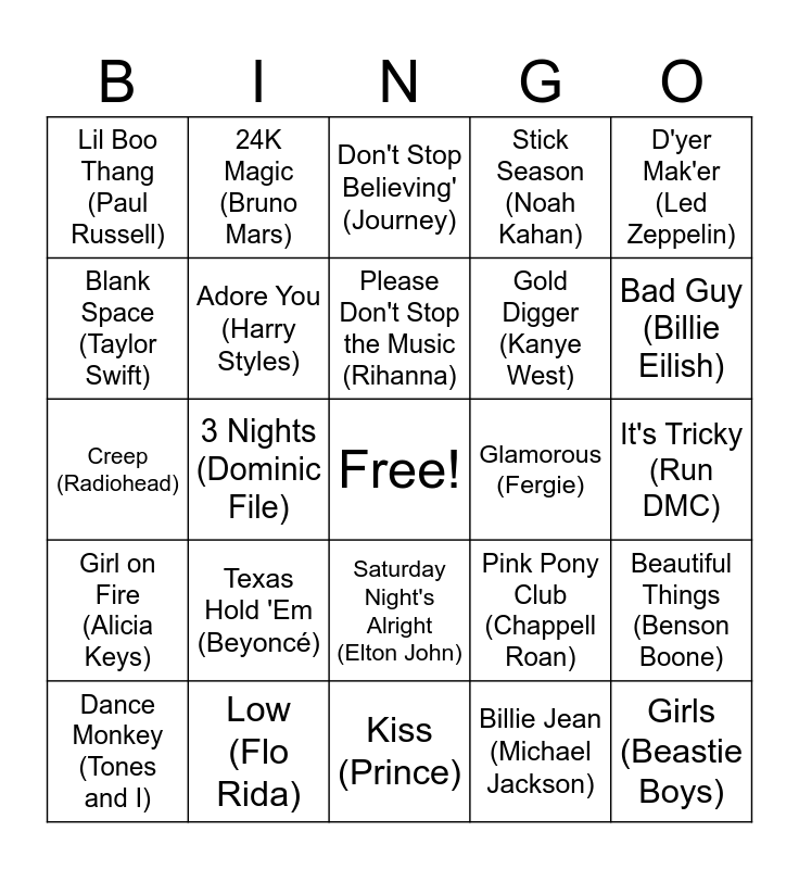 This bingo card has a free space and 29 words: Dance Monkey (Tones and I), Fantasy (Mariah Carey), 3 Nights (Dominic File), Baby (Justin Bieber), Lil Boo Thang (Paul Russell), Don't Stop Believing' (Journey), Adore You (Harry Styles), Texas Hold 'Em (Beyoncé), Glamorous (Fergie), Low (Flo Rida), It's Tricky (Run DMC), Girls (Beastie Boys), Kiss (Prince), Billie Jean (Michael Jackson), Bad Guy (Billie Eilish), Yellow Submarine (The Beatles), Saturday Night's Alright (Elton John), Girl on Fire (Alicia Keys), D'yer Mak'er (Led Zeppelin), Creep (Radiohead), Pink Pony Club (Chappell Roan), Can I Kick It? (A Tribe Called Quest), Gold Digger (Kanye West), Blank Space (Taylor Swift), Stick Season (Noah Kahan), 24K Magic (Bruno Mars), Beautiful Things (Benson Boone), Please Don't Stop the Music (Rihanna) and Too Sweet (Hozier).