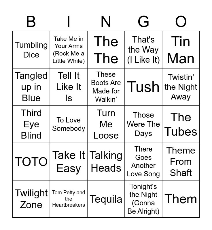 This bingo card has 47 words: Free!, Turn Me Loose, Take The Long Way Home, Tequila, Take It Easy, Take Me Home, Country Roads, Take Me in Your Arms (Rock Me a Little While), Takin' Care Of Business, Tangled up in Blue, Tell Her No, Tell It Like It Is, That's the Way (I Like It), Theme From Shaft, There Goes Another Love Song, There Is a Mountain, These Eyes, These Boots Are Made for Walkin', Those Were The Days, Tie a Yellow Ribbon Round the Ole Oak Tree, Tin Man, To Love Somebody, Tonight's the Night (Gonna Be Alright), Tumbling Dice, Tush, Twist And Shout, Twistin' the Night Away, Twilight Zone, Tina Turner, Talking Heads, TOTO, T. Rex, Thin Lizzy, Tears For Fears, Tesla, Twisted Sister, Tom Petty and the Heartbreakers, The Tubes, Ten Years After, Ted Nugent, The Troggs, Them, The The, Third Eye Blind, Three Dog Night, 'Til Tuesday, Tommy Tutone and Traffic.