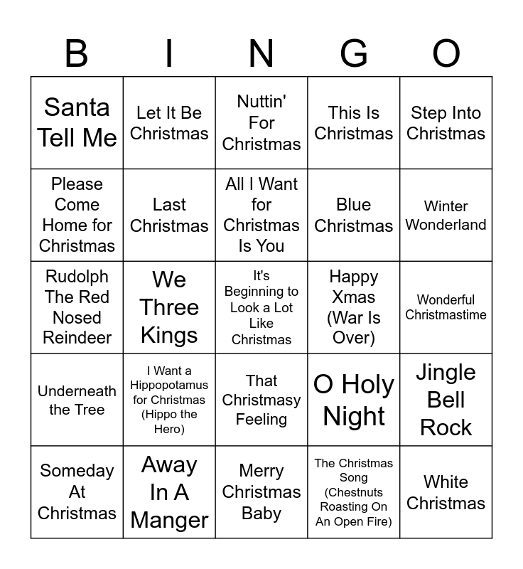 This bingo card has 39 words: Free!, Do They Know It's Christmas?, It's Christmas Time Again, Last Christmas, Someday At Christmas, That Christmasy Feeling, All I Want for Christmas Is You, Santa Baby, Step Into Christmas, Underneath the Tree, We Three Kings, This Is Christmas, It's Beginning to Look a Lot Like Christmas, Wonderful Christmastime, Happy Xmas (War Is Over), I Want a Hippopotamus for Christmas (Hippo the Hero), (There's No Place Like) Home for the Holidays, Santa Tell Me, You're A Mean One Mr. Grinch, O Holy Night, Please Come Home for Christmas, Merry Christmas Baby, Blue Christmas, Winter Wonderland, The Christmas Song (Merry Christmas To You), Christmas Cookies, White Christmas, A Holly Jolly Christmas, Have Yourself A Merry Little Christmas, Let It Be Christmas, Boogie Woogie Santa, Frosty The Snowman, Nuttin' For Christmas, Away In A Manger, The Christmas Song (Chestnuts Roasting On An Open Fire), Baby It's Cold Outside, Jingle Bell Rock, Rudolph The Red Nosed Reindeer and Christmas Don't Be Late.