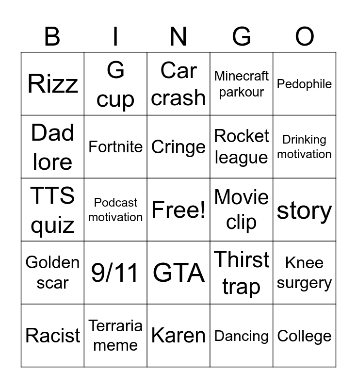 This bingo card has a free space and 24 words: Racist, 9/11, Cringe, Dancing, Pedophile, Rizz, G cup, Car crash, Movie clip, story, TTS quiz, Fortnite, Thirst trap, Knee surgery, Dad lore, Terraria meme, Karen, Minecraft parkour, Drinking motivation, Golden scar, Podcast motivation, GTA, Rocket league and College.