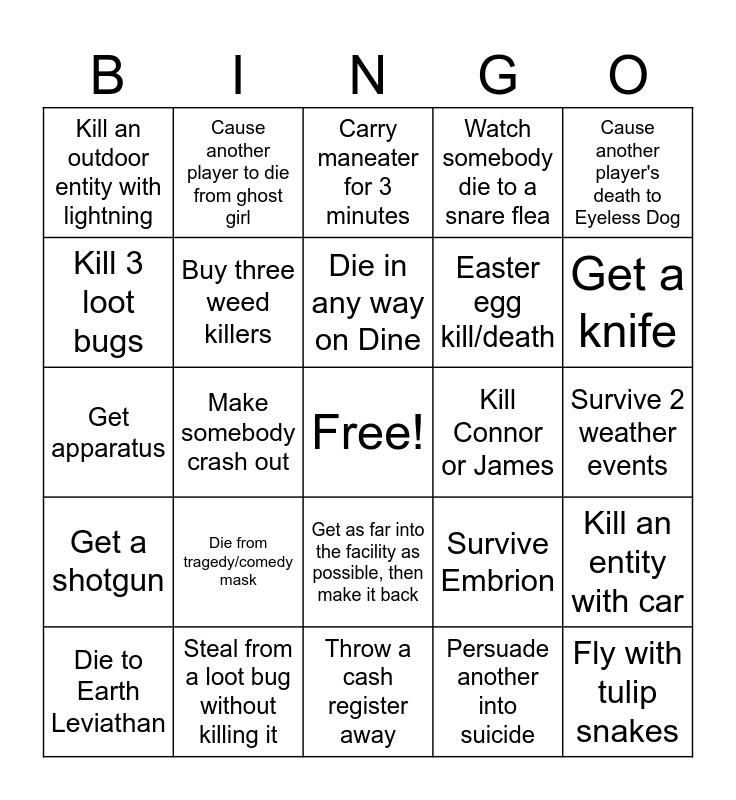 This bingo card has a free space and 24 words: Die to Earth Leviathan, Die from tragedy/comedy mask, Die in any way on Dine, Persuade another into suicide, Cause another player's death to Eyeless Dog, Kill an outdoor entity with lightning, Cause another player to die from ghost girl, Carry maneater for 3 minutes, Kill Connor or James, Survive 2 weather events, Get apparatus, Buy three weed killers, Survive Embrion, Kill an entity with car, Kill 3 loot bugs, Steal from a loot bug without killing it, Throw a cash register away, Watch somebody die to a snare flea, Get a knife, Get a shotgun, Make somebody crash out, Get as far into the facility as possible, then make it back, Easter egg kill/death and Fly with tulip snakes.