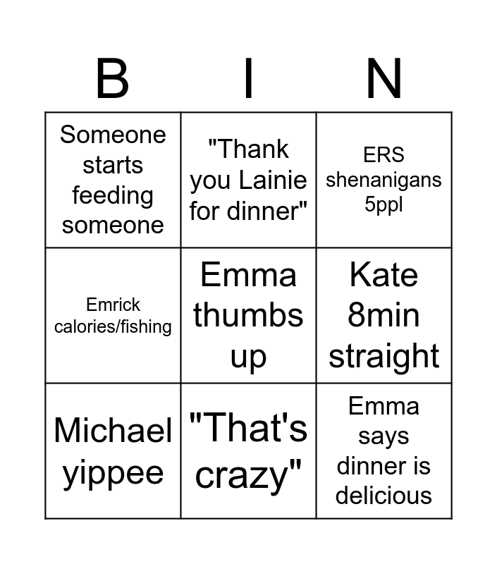 This bingo card has a free space and 8 words: Kate 8min straight, ERS shenanigans 5ppl, "Thank you Lainie for dinner", Michael yippee, Someone starts feeding someone, Emma says dinner is delicious, Emrick calories/fishing and "That's crazy".