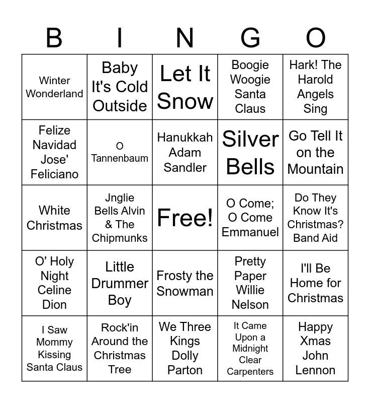 This bingo card has a free space and 24 words: Little Drummer Boy, Rock'in Around the Christmas Tree, Hanukkah Adam Sandler, I Saw Mommy Kissing Santa Claus, Hark! The Harold Angels Sing, Winter Wonderland, Felize Navidad Jose' Feliciano, Baby It's Cold Outside, O Come; O Come Emmanuel, Frosty the Snowman, Silver Bells, White Christmas, Pretty Paper Willie Nelson, I'll Be Home for Christmas, O Tannenbaum, It Came Upon a Midnight Clear Carpenters, Do They Know It's Christmas? Band Aid, Let It Snow, Go Tell It on the Mountain, Jnglie Bells Alvin & The Chipmunks, Happy Xmas John Lennon, O' Holy Night Celine Dion, Boogie Woogie Santa Claus and We Three Kings Dolly Parton.