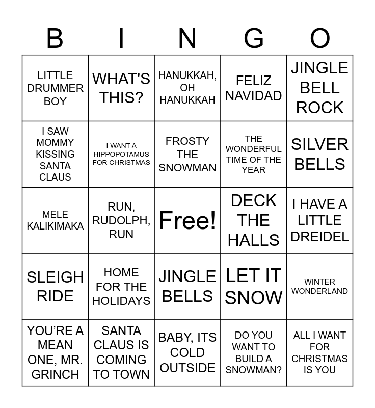 This bingo card has a free space and 24 words: HOME FOR THE HOLIDAYS, SANTA CLAUS IS COMING TO TOWN, FROSTY THE SNOWMAN, YOU’RE A MEAN ONE, MR. GRINCH, JINGLE BELL ROCK, LITTLE DRUMMER BOY, I SAW MOMMY KISSING SANTA CLAUS, WHAT'S THIS?, DECK THE HALLS, JINGLE BELLS, THE WONDERFUL TIME OF THE YEAR, MELE KALIKIMAKA, LET IT SNOW, WINTER WONDERLAND, I WANT A HIPPOPOTAMUS FOR CHRISTMAS, DO YOU WANT TO BUILD A SNOWMAN?, I HAVE A LITTLE DREIDEL, HANUKKAH, OH HANUKKAH, SILVER BELLS, RUN, RUDOLPH, RUN, ALL I WANT FOR CHRISTMAS IS YOU, SLEIGH RIDE, FELIZ NAVIDAD and BABY, ITS COLD OUTSIDE.