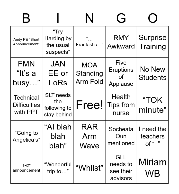 This bingo card has a free space and 35 words: Massive Thank You, Flexible SNN, K-Pray, JAN EE or LoRs, RAR Arm Wave, RMY Awkward, FMN “It’s a busy…”, So & So is visiting, MOA Standing Arm Fold, Ron Speaks, Technical Difficulties with PPT, Surprise Training, JBY “Assessments”, Random ALE announcement, Andy PE “Short Announcement”, Health Tips from nurse, GLL needs to see their advisors, SLT needs the following to stay behind, “Going to Angelica’s”, Miriam WB, Socheata Oun mentioned, 1-off announcement, I need the teachers of “_”, “Wonderful trip to…”, “…Frantastic…”, No New Students, New Student Lady Speaks, Awkward New Staff Introduction, Five Eruptions of Applause, “TOK minute”, “Welchism’s”, “Whilst”, “AI blah blah blah”, “Try Harding by the usual suspects” and “The Wrong Birthday…”.