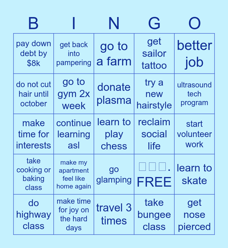 This bingo card has 25 words: make my apartment feel like home again, travel 3 times, donate plasma, do highway class, better job, pay down debt by $8k, do not cut hair until october, get back into pampering, reclaim social life, go glamping, try a new hairstyle, make time for interests, 𝓐ᥫ᭡. FREE, learn to skate, go to gym 2x week, get nose pierced, start volunteer work, go to a farm, ultrasound tech program, continue learning asl, learn to play chess, make time for joy on the hard days, take cooking or baking class, get sailor tattoo and take bungee class.