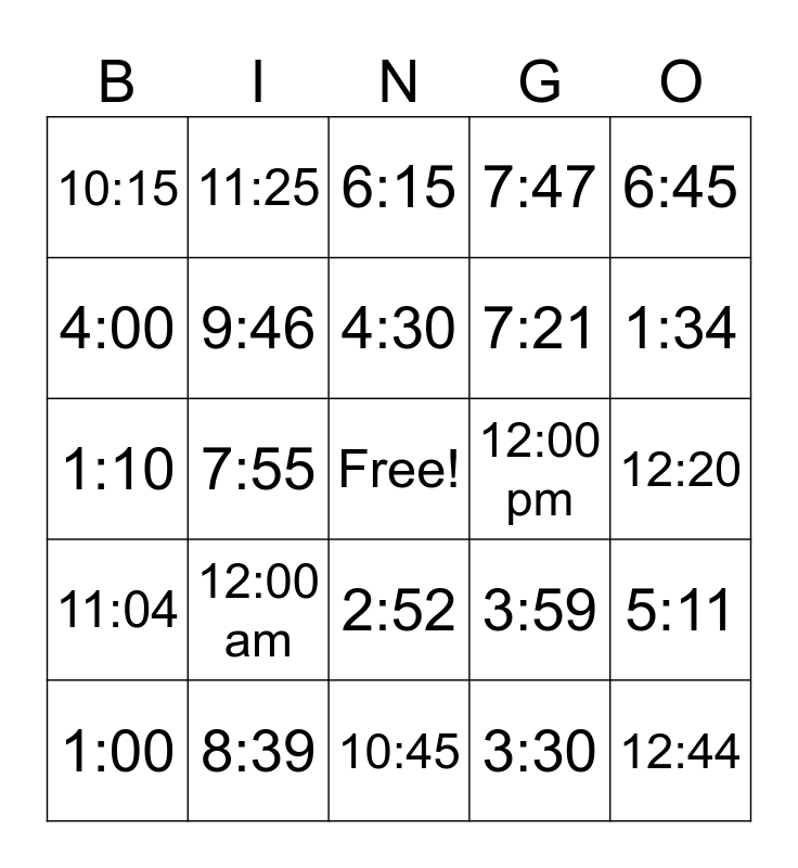 This bingo card has a free space and 24 words: 12:00 am, 8:39, 4:30, 1:00, 6:45, 10:15, 4:00, 11:25, 12:00 pm, 2:52, 7:21, 1:10, 3:59, 5:11, 9:46, 3:30, 12:20, 6:15, 1:34, 7:55, 12:44, 11:04, 7:47 and 10:45.