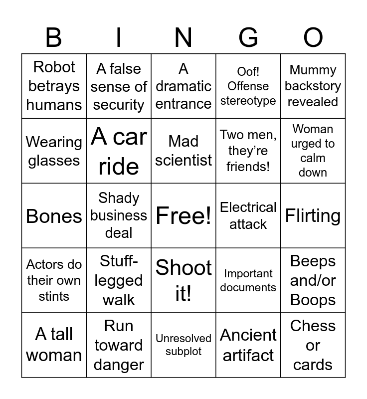 This bingo card has a free space and 24 words: Stuff-legged walk, Run toward danger, Mad scientist, A tall woman, Mummy backstory revealed, Robot betrays humans, Wearing glasses, A false sense of security, Electrical attack, Shoot it!, Two men, they’re friends!, Bones, Important documents, Beeps and/or Boops, A car ride, Ancient artifact, Flirting, A dramatic entrance, Woman urged to calm down, Shady business deal, Chess or cards, Actors do their own stints, Oof! Offense stereotype and Unresolved subplot.