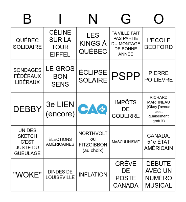 This bingo card has a free space and 24 words: ÉLECTIONS AMÉRICAINES, DINDES DE LOUISEVILLE, ÉCLIPSE SOLAIRE, "WOKE", L'ÉCOLE BEDFORD, QUÉBEC SOLIDAIRE, SONDAGES FÉDÉRAUX LIBÉRAUX, CÉLINE SUR LA TOUR EIFFEL, IMPÔTS DE CODERRE, NORTHVOLT ou FITZGIBBON (au choix), PSPP, DEBBY, MASCULINISME, CANADA, 51e ÉTAT AMÉRICAIN, LE GROS BON SENS, GRÈVE DE POSTE CANADA, RICHARD MARTINEAU (Okay j'avoue c'est quaisement gratuit), LES KINGS À QUÉBEC, PIERRE POILIEVRE, 3e LIEN (encore), DÉBUTE AVEC UN NUMÉRO MUSICAL, UN DES SKETCH C'EST JUSTE DU GUEULAGE, TA VILLE FAIT PAS PARTIE DU MONTAGE DE BONNE ANNÉE and INFLATION.