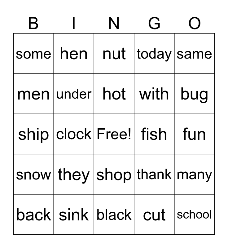 This bingo card has a free space and 24 words: they, sink, hot, back, same, some, men, hen, fish, shop, with, ship, thank, many, under, cut, fun, nut, bug, clock, school, snow, today and black.