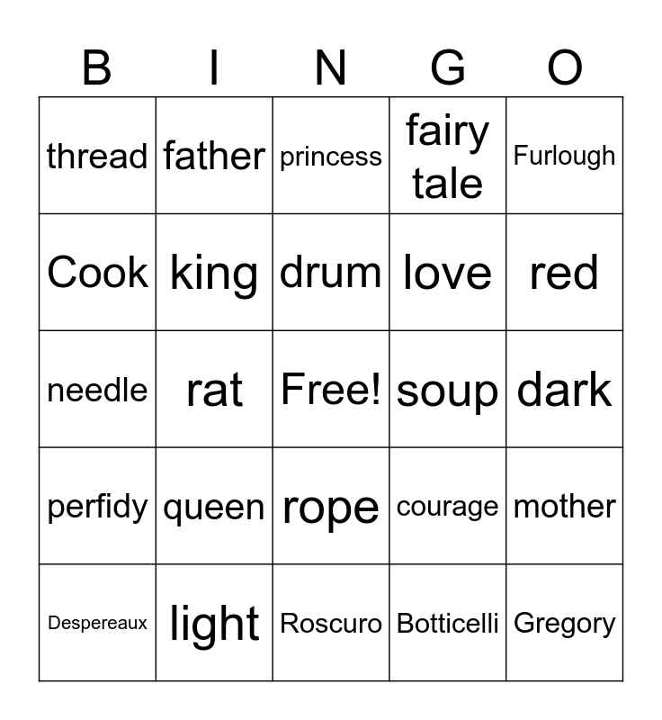 This bingo card has a free space and 29 words: Despereaux, mouse, rat, dungeon, thread, princess, king, queen, soup, light, dark, Gregory, Roscuro, Botticelli, red, castle, rope, perfidy, Furlough, needle, courage, spool, love, Cook, fairy tale, father, mother, drum and Kate DiCamillo.