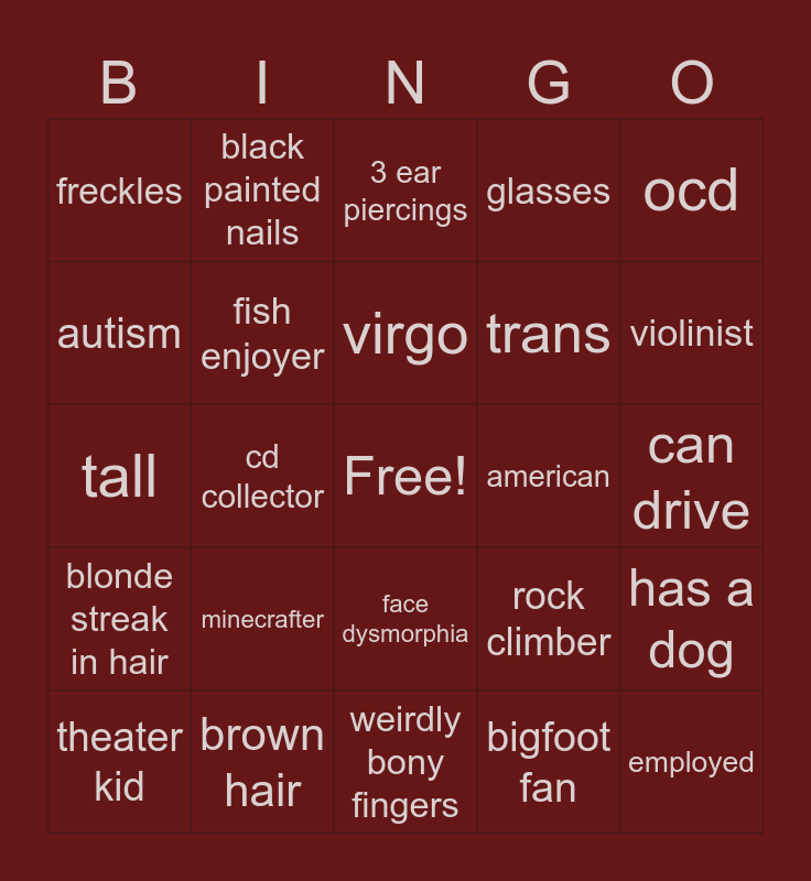This bingo card has a free space and 24 words: minecrafter, brown hair, virgo, theater kid, ocd, freckles, autism, black painted nails, american, face dysmorphia, trans, tall, rock climber, has a dog, fish enjoyer, bigfoot fan, can drive, 3 ear piercings, violinist, cd collector, employed, blonde streak in hair, glasses and weirdly bony fingers.
