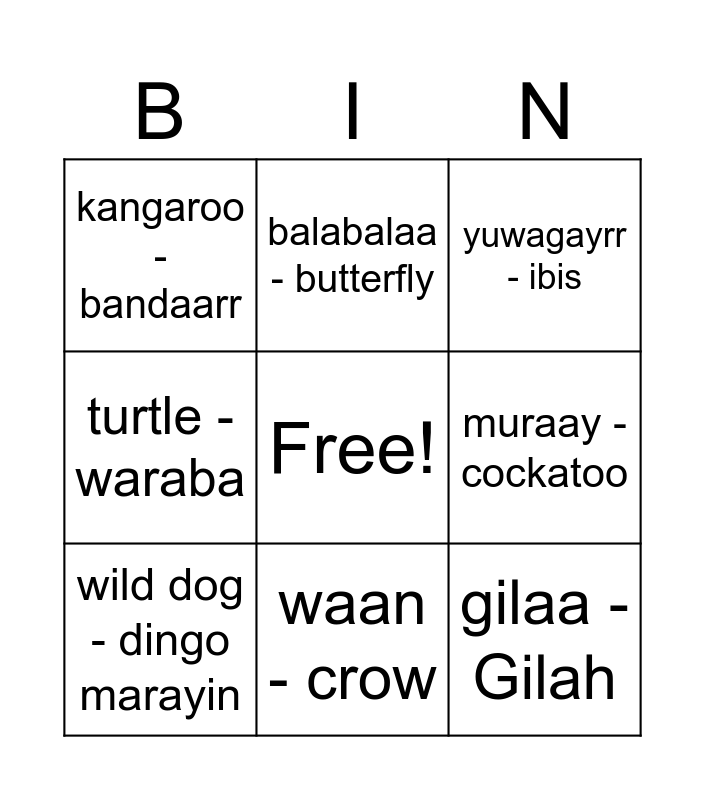 This bingo card has a free space and 12 words: yin.ga - Yabby, guda - koala, gilaa - Gilah, muraay - cockatoo, balabalaa - butterfly, yuwagayrr - ibis, waan - crow, possum - muthay, kangaroo - bandaarr, turtle -waraba, wild dog - dingo marayin and echidna - bigibila.