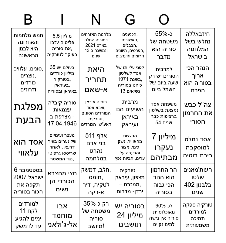 This bingo card has 36 words: טורקיה – מצפון, עיראק – ממזרח, ירדן- מדרום, חלב, דמשק, חומס, לטקיה, דיר א-רקה, בסוריה יש 24 מיליון תושבים, סונים, עלווים, נוצרים, כורדים ודרוזים, אסד הוא עלאווי, מרבית השיעים הם באיראן ועיראק, בעולם יש 35 מיליון כורדים בטורקיה, בעיראק, באיראן ובסוריה, רק כ 35% משטחה של סוריה מיושב!, כ-55% משטחה של סוריה הוא מדבר, הר החרמון הוא ההר הכי גבוה בסוריה, הנהר הכי ארוך בסוריה הוא הפרת, הכנענים, האשורים, הבבלים, הפרסים, היוונים, הרומים והערבים, העות'מאנים שלטו בלבנון 402 שנים, סוריה קיבלה עצמאות מצרפת ב - 17.04.1946, לפני עלייתו של אסד לשלטון בשנת 1971, כיהנו בסוריה 13 נשיאים, חמש מלחמות והאחרונה היא לבנון הראשונה, 6 בספטמבר 2007 ישראל תקפה את הכור בסוריה, משפחת אסד נמצאת בשלטון ברציפות כבר 54 שנים, מפלגת הבעת, מלחמת האזרחים בסוריה החלה במרס 2021 ונמשכה כ-13 שנים, רוסיה איראן וצבא אסד, המורדים הסונים וטורקיה, דאע"ש, הכורדים, מעצר ועינויים של נערים בעיר דרעא , לאחר שריססו גרפיטי נגד המשטר,, הפצצות מהאוויר, נשק כימי, מצור והרעבה על ערים, חביות נפץ, 511 אלף בני אדם נהרגו במלחמה, 7 מיליון נעקרו מבתיהם, 5.5 מיליון פליטים עזבו את סוריה, בעיקר לטורקיה, למרבית הסורים יש רק שעה ביום של חשמל ביום, אבו מוחמד אל-ג'ולאני, היאת תחריר א-שאם, חיזבאללה נחלש בשל המלחמה בישראל, טורקיה ספקה למורדים תמיכה משמעותית, למורדים לקח 11 ימים להגיע עד לדמשק, אסד נמלט למוסקבה בירת רוסיה, צה"ל כבש את החרמון הסורי, חצי מהצבא הכורדי הן נשים and לכ-90% מאוכלוסיית סוריה אין גישה למים נקיים.
