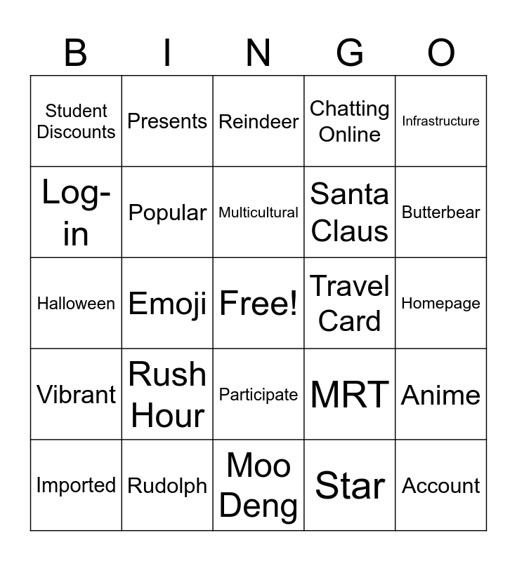 This bingo card has a free space and 39 words: Successful, Culture, Entertaining, Popular, Imported, Participate, Multicultural, Ancestors, Infrastructure, Vibrant, Emoji, Chatting Online, Account, Homepage, Travel Card, Rush Hour, Off Peak, Student Discounts, BTS, MRT, Log-in, Moo Deng, Santa Claus, Butterbear, Marvel, Wonder, Christmas, Lights, Candy Canes, Presents, Elf, Mrs. Claus, Reindeer, Rudolph, Star, Ornaments, Anime, Halloween and Bows.