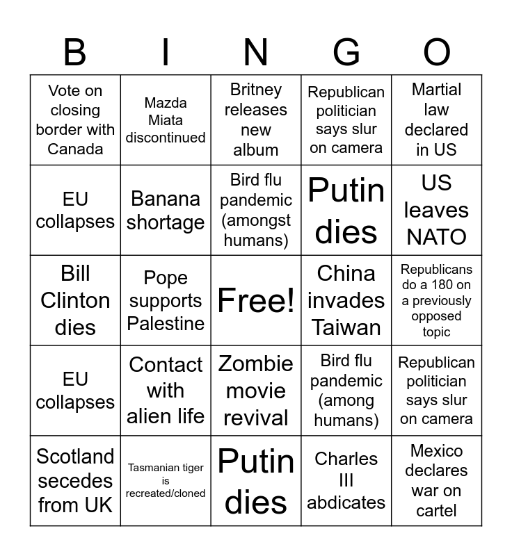 This bingo card has a free space and 31 words: Putin dies, Famous person dies at 27, Pope supports Palestine, Tasmanian tiger is recreated/cloned, Vote on closing border with Canada, Britney releases new album, Banana shortage, Bird flu pandemic (among humans), China invades Taiwan, Charles III abdicates, Republicans do a 180 on a previously opposed topic, Mexico declares war on cartel, Bill Clinton dies, Major consumer-level stride in eugenics, US leaves NATO, <$1/gal gasoline, Republican politician says slur on camera, Contact with alien life, EU collapses, Zombie movie revival, Martial law declared in US, Bitcoin hits 200K, Scotland secedes from UK, Mazda Miata discontinued, Putin dies, EU collapses, Republican politician says slur on camera, Bill Clinton dies, Tasmanian tiger is recreated/cloned, Bird flu pandemic (amongst humans) and Vote on closing border with Canada.