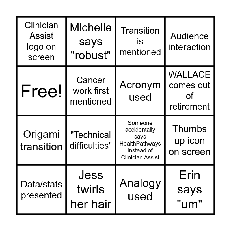 This bingo card has 16 words: Jess twirls her hair, Thumbs up icon on screen, Transition is mentioned, Clinician Assist logo on screen, Origami transition, Michelle says "robust", Someone accidentally says HealthPathways instead of Clinician Assist, Analogy used, Free!, Cancer work first mentioned, Data/stats presented, Audience interaction, "Technical difficulties", WALLACE comes out of retirement, Acronym used and Erin says "um".