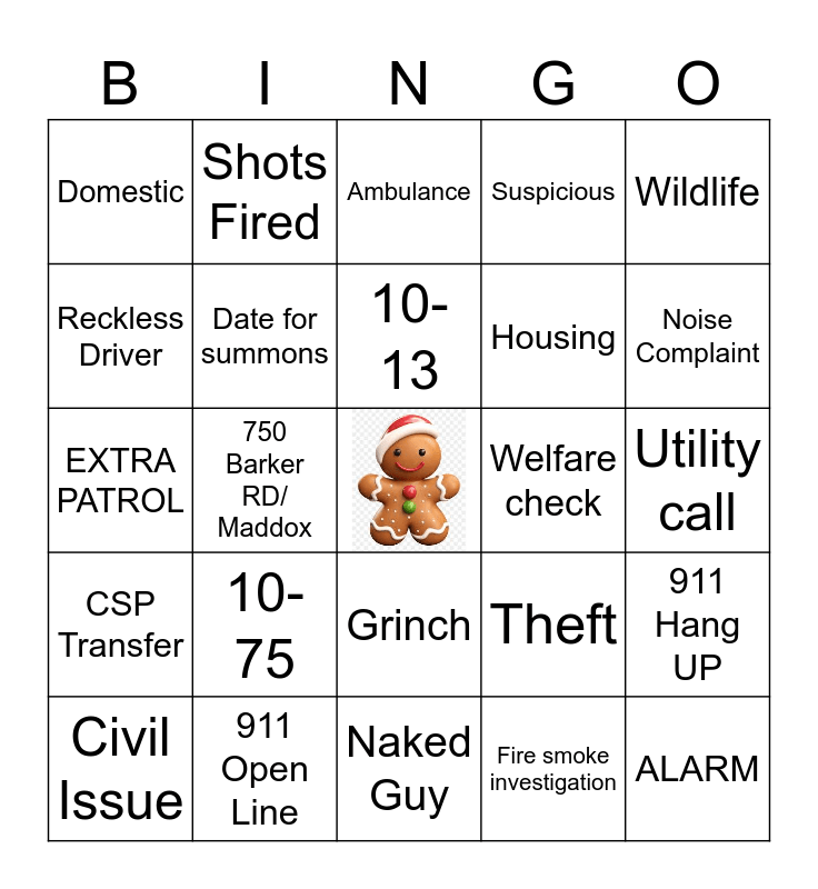This bingo card has a free space and 24 words: 10-75, 911 Open Line, 10-13, Civil Issue, Wildlife, Domestic, Reckless Driver, Shots Fired, Welfare check, Grinch, Housing, EXTRA PATROL, Theft, 911 Hang UP, Date for summons, Fire smoke investigation, Utility call, Ambulance, Noise Complaint, 750 Barker RD/ Maddox, ALARM, CSP Transfer, Suspicious and Naked Guy.