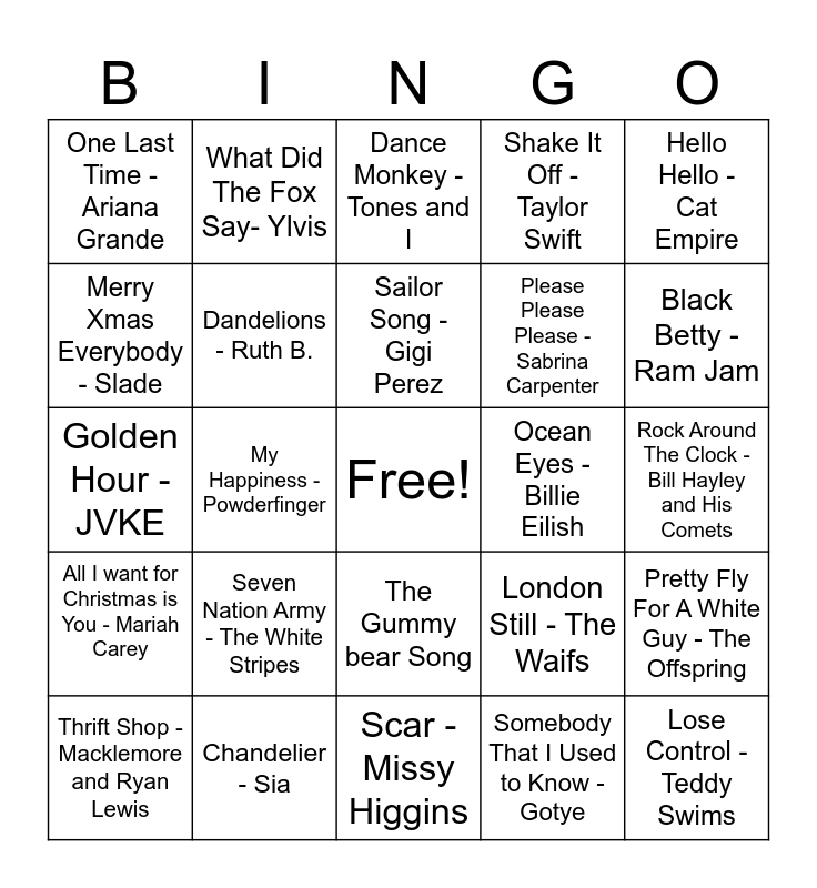 This bingo card has a free space and 29 words: Symphony - Clean Bandit, Zara Larsson, Chandelier - Sia, Dance Monkey - Tones and I, Sky Full Of Stars - Coldplay, Hello Hello - Cat Empire, One Last Time - Ariana Grande, Dandelions - Ruth B., Sailor Song - Gigi Perez, Ocean Eyes - Billie Eilish, Pretty Fly For A White Guy - The Offspring, Thrift Shop - Macklemore and Ryan Lewis, My Happiness - Powderfinger, Somebody That I Used to Know - Gotye, Lose Control - Teddy Swims, Golden Hour - JVKE, Zebra - John Butler, Scar - Missy Higgins, London Still - The Waifs, Black Betty - Ram Jam, All I want for Christmas is You - Mariah Carey, Seven Nation Army - The White Stripes, We Are The Champions - Queen, Please Please Please - Sabrina Carpenter, Rock Around The Clock - Bill Hayley and His Comets, Merry Xmas Everybody - Slade, What Did The Fox Say- Ylvis, The Gummy bear Song, Shake It Off - Taylor Swift and All in This Together - High School Musical.