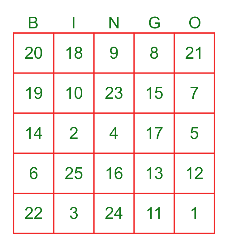 This bingo card has 25 words: 25, 24, 23, 22, 21, 20, 19, 18, 17, 16, 15, 14, 13, 12, 10, 1, 5, 9, 7, 2, 4, 3, 6, 8 and 11.