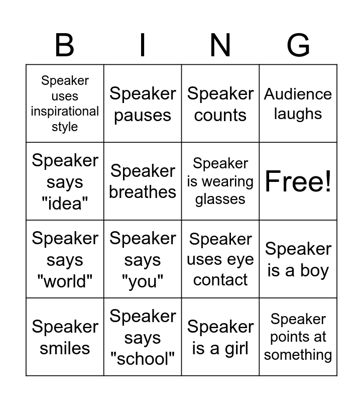 This bingo card has 18 words: Speaker says "you", Speaker points at something, Speaker counts, Speaker uses inspirational style, Speaker uses eye contact, Audience laughs, Speaker smiles, Speaker pauses, Free!, Speaker says "world", Speaker is a girl, Speaker says "idea", Speaker is a boy, Speaker breathes, Speaker is wearing glasses, Speaker uses humor, Speaker says "school" and Speaker frowns.