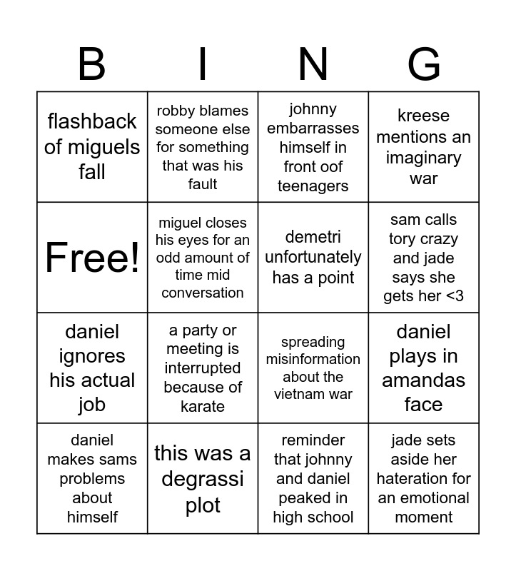 This bingo card has 16 words: this was a degrassi plot, daniel plays in amandas face, johnny embarrasses himself in front oof teenagers, flashback of miguels fall, daniel ignores his actual job, robby blames someone else for something that was his fault, spreading misinformation about the vietnam war, reminder that johnny and daniel peaked in high school, Free!, miguel closes his eyes for an odd amount of time mid conversation, daniel makes sams problems about himself, kreese mentions an imaginary war, a party or meeting is interrupted because of karate, sam calls tory crazy and jade says she gets her <3, demetri unfortunately has a point and jade sets aside her hateration for an emotional moment.