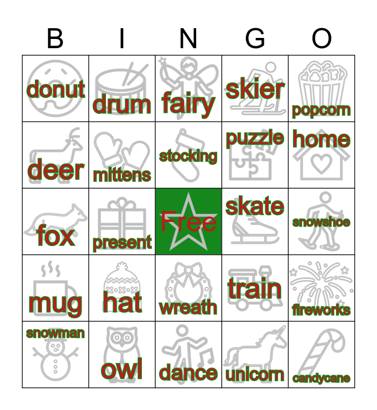 This bingo card has 39 images, a free space and 39 words: cookie, snowflake, tree, mittens, snowman, wreath, stocking, campfire, popcorn, mug, present, skier, candycane, snowshoe, skate, hat, gnome, donut, mountains, train, deer, dance, puzzle, home, sweater, sled, hockey, bear, wolf, drum, penguin, bell, fairy, owl, unicorn, holly, fireworks, fox and squirrel.