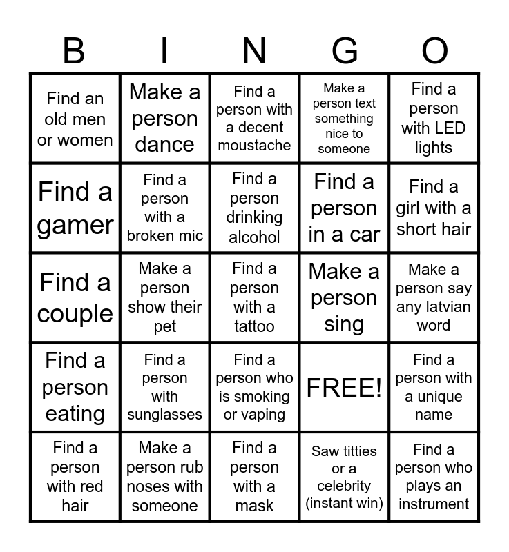 This bingo card has 25 words: Find a person with sunglasses, Find a person with a mask, Find a person drinking alcohol, Find a person with red hair, Find a person with LED lights, Find an old men or women, Find a gamer, Make a person dance, Make a person sing, Find a person who is smoking or vaping, Find a person in a car, Find a couple, FREE!, Find a person with a unique name, Find a person with a broken mic, Find a person who plays an instrument, Make a person say any latvian word, Find a person with a decent moustache, Find a girl with a short hair, Make a person show their pet, Find a person with a tattoo, Make a person rub noses with someone, Find a person eating, Make a person text something nice to someone and Saw titties or a celebrity (instant win).