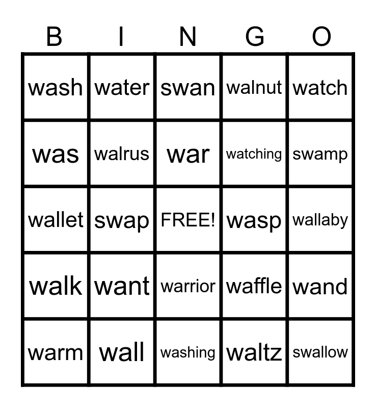 This bingo card has a free space and 24 words: want, wall, war, warm, watch, wash, was, water, wasp, warrior, watching, wallet, waffle, wand, walrus, waltz, wallaby, swan, swamp, swap, swallow, walk, walnut and washing.