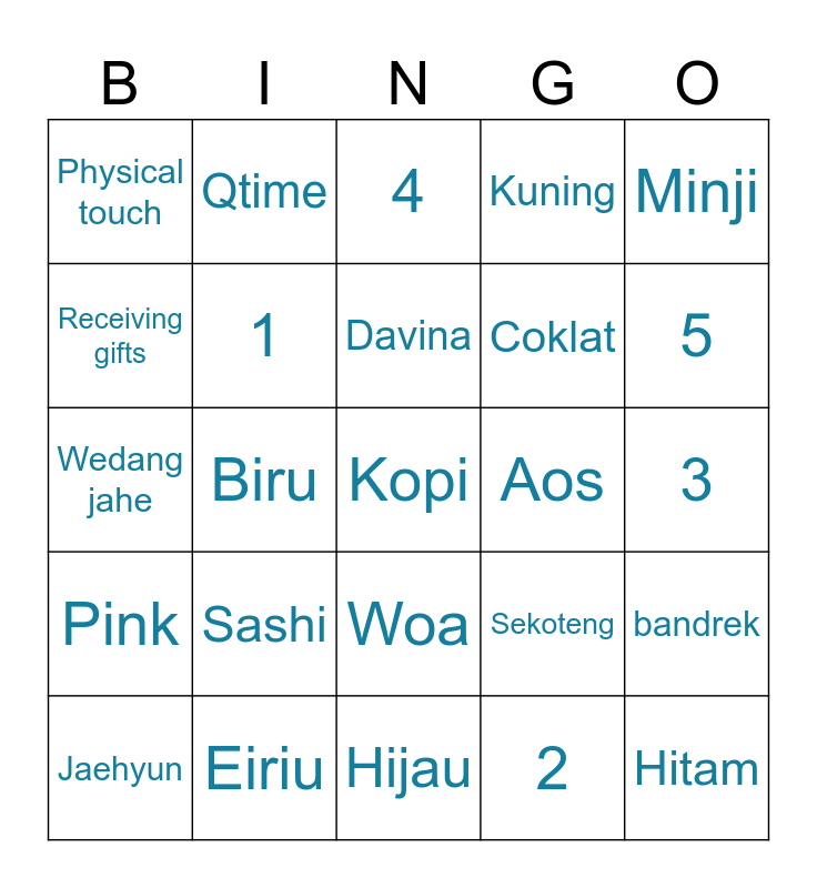 This bingo card has a free space and 24 words: Sashi, Eiriu, Davina, Jaehyun, Minji, Physical touch, Receiving gifts, Qtime, Aos, Woa, Coklat, Wedang jahe, Sekoteng, bandrek, 1, 2, 3, 4, 5, Biru, Hitam, Pink, Kuning and Hijau.