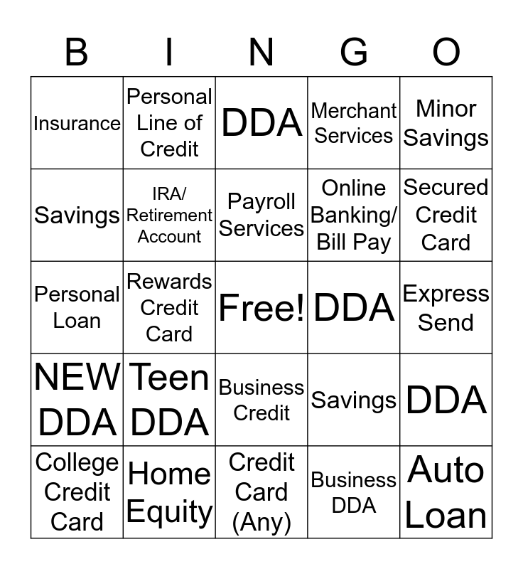 This bingo card has a free space and 24 words: Teen DDA, Home Equity, Payroll Services, College Credit Card, Minor Savings, Insurance, Savings, Personal Line of Credit, DDA, Business Credit, Online Banking/ Bill Pay, Personal Loan, Savings, DDA, IRA/ Retirement Account, Business DDA, Express Send, DDA, Secured Credit Card, Rewards Credit Card, Auto Loan, NEW DDA, Merchant Services and Credit Card (Any).