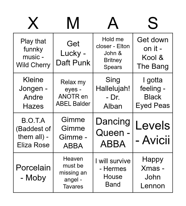 This bingo card has 30 words: Encore une fois - sash!, 22 - Taylor Swift, Levels - Avicii, Chasing Hights - Alma, Play that funnky music - Wild Cherry, Hold me closer - Elton John & Britney Spears, Sing Hallelujah! - Dr. Alban, Bailando - Paradisio, Heaven must be missing an angel - Tavares, Wake me up before you go-go - Wham!, I will survive - Hermes House Band, Porcelain - Moby, Happy - Pharrel Willliams, I will survive - Gloria Gaynor, Gimme Gimme Gimme - ABBA, Music Sounds Better With You - Stardust, Spank - KC and the Sunshine Band, Happy Xmas - John Lennon, Calm Down - Rema, Kleine Jongen - Andre Hazes, Dancing Queen - ABBA, Banana Pancakes - Jack Johnson, Get Lucky - Daft Punk, B.O.T.A (Baddest of them all) - Eliza Rose, Relax my eyes - ANOTR en ABEL Balder, Get down on it - Kool & The Bang, Memories - David Guetta, All I Want for Christmas is you - Mariah Carey, I gotta feeling - Black Eyed Peas and Whine & Kotch - J Capri & Charly Black.