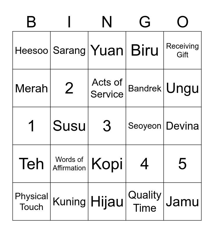This bingo card has a free space and 24 words: Physical Touch, Words of Affirmation, Acts of Service, Quality Time, Receiving Gift, Heesoo, Sarang, Yuan, Seoyeon, Devina, 1, 2, 4, 5, Merah, Kuning, Hijau, Biru, Ungu, Teh, Susu, Kopi, Bandrek and Jamu.