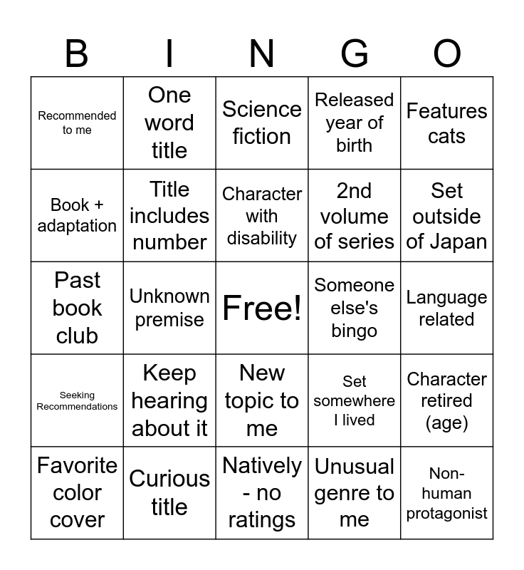 This bingo card has a free space and 25 words: Keep hearing about it, Natively - no ratings, Character with disability, Favorite color cover, Features cats, Recommended to me, Book + adaptation, One word title, Someone else's bingo, New topic to me, 2nd volume of series, Past book club, Set somewhere I lived, Character retired (age), Title includes number, New Natively level to me, Language related, Science fiction, Set outside of Japan, Unknown premise, Non-human protagonist, Curious title, Seeking Recommendations, Released year of birth and Unusual genre to me.