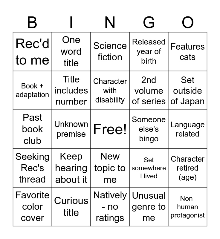This bingo card has a free space and 25 words: Keep hearing about it, Natively - no ratings, Character with disability, Favorite color cover, Features cats, Rec'd to me, Book + adaptation, One word title, Someone else's bingo, New topic to me, 2nd volume of series, Past book club, Set somewhere I lived, Character retired (age), Title includes number, New Natively level to me, Language related, Science fiction, Set outside of Japan, Unknown premise, Non-human protagonist, Curious title, Seeking Rec's thread, Released year of birth and Unusual genre to me.