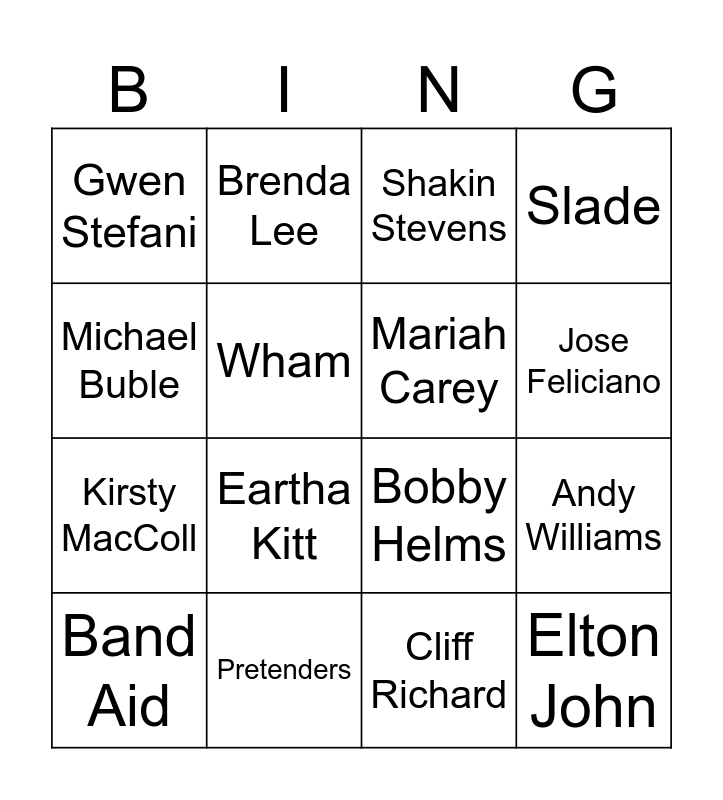 This bingo card has 16 words: Band Aid, Pretenders, Shakin Stevens, Slade, Michael Buble, Brenda Lee, Bobby Helms, Andy Williams, Gwen Stefani, Wham, Cliff Richard, Jose Feliciano, Kirsty MacColl, Eartha Kitt, Mariah Carey and Elton John.