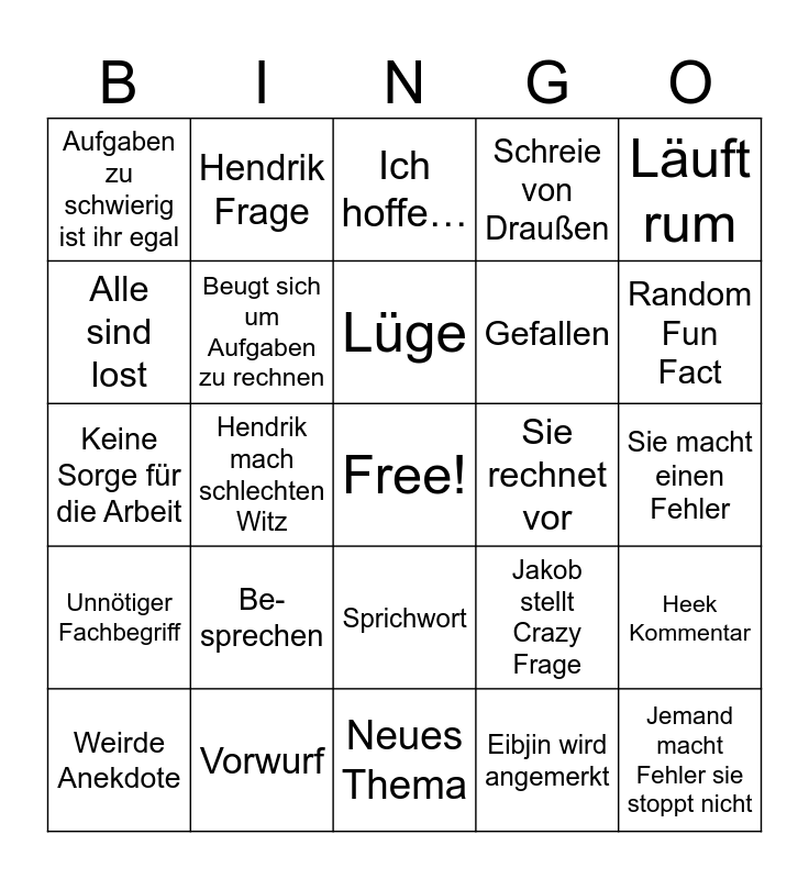 This bingo card has a free space and 24 words: Be-sprechen, Vorwurf, Lüge, Weirde Anekdote, Läuft rum, Aufgaben zu schwierig ist ihr egal, Alle sind lost, Hendrik Frage, Sie rechnet vor, Sprichwort, Gefallen, Keine Sorge für die Arbeit, Jakob stellt Crazy Frage, Heek Kommentar, Beugt sich um Aufgaben zu rechnen, Eibjin wird angemerkt, Sie macht einen Fehler, Ich hoffe…, Random Fun Fact, Hendrik mach schlechten Witz, Jemand macht Fehler sie stoppt nicht, Unnötiger Fachbegriff, Schreie von Draußen and Neues Thema.