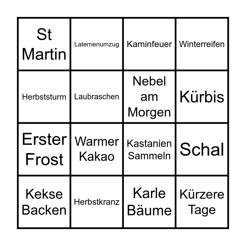 This bingo card has 16 words: Herbstkranz, Schal, Kaminfeuer, St Martin, Erster Frost, Laternenumzug, Kastanien Sammeln, Karle Bäume, Herbststurm, Laubraschen, Kekse Backen, Winterreifen, Warmer Kakao, Kürbis, Nebel am Morgen and Kürzere Tage.