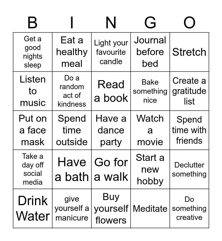This bingo card has a free space and 24 words: Have a bath, give yourself a manicure, Read a book, Drink Water, Stretch, Get a good nights sleep, Listen to music, Eat a healthy meal, Watch a movie, Go for a walk, Bake something nice, Put on a face mask, Start a new hobby, Declutter something, Do a random act of kindness, Meditate, Spend time with friends, Light your favourite candle, Create a gratitude list, Spend time outside, Do something creative, Take a day off social media, Journal before bed and Buy yourself flowers.